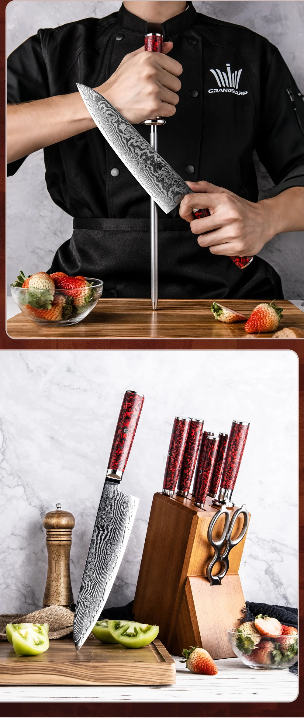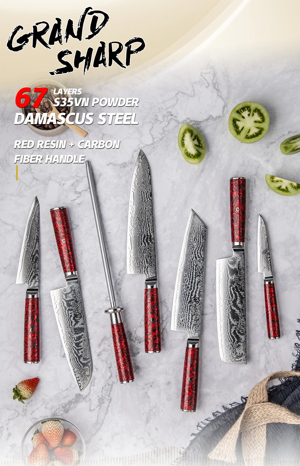 Grandsharp Kitchen Knife Sets 67 Layers Damascus S35VN Powder Core Steel Knives Set Sharp Knife with Sharpening Rod & Scissor