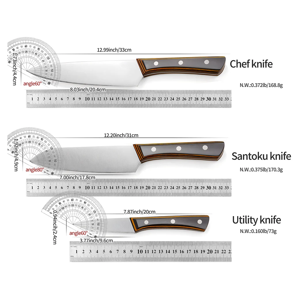 1. High-Quality Materials: This Japanese style kitchen knife forged with 3Cr13 stainless steel, have excellent hardness and durability.Kitchen knife is crafted by artisans with exquisite skills and attention to detail, being unique and reflecting craftsmanship and quality.
