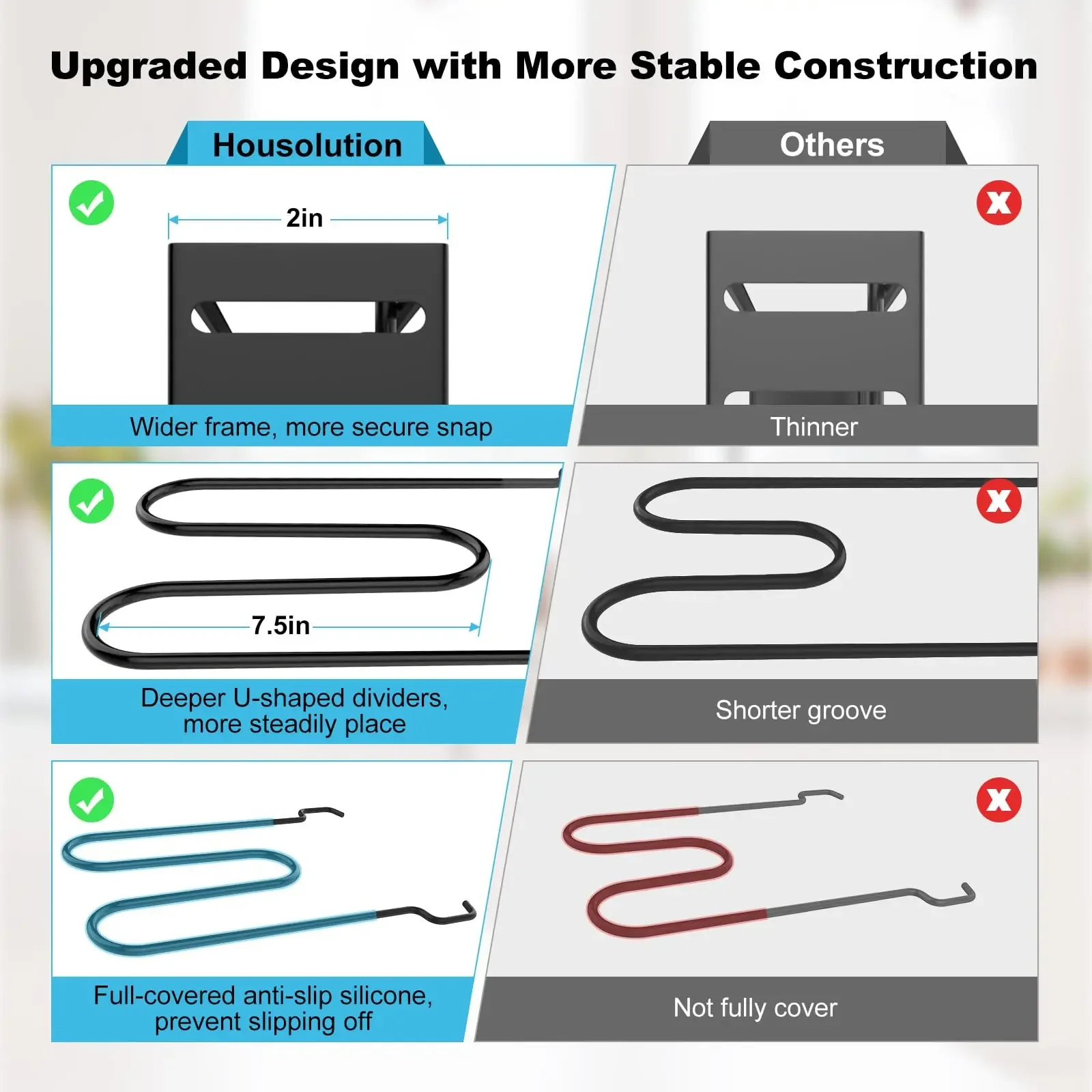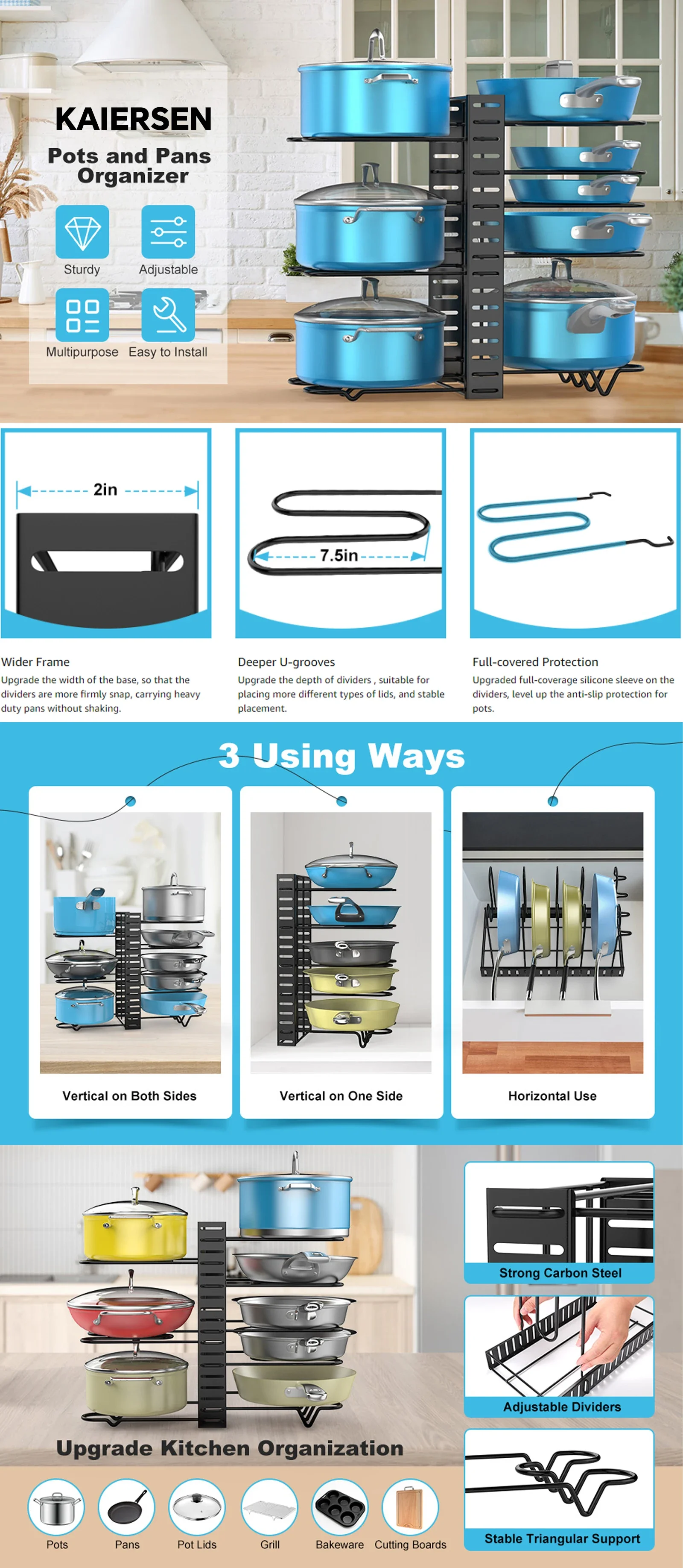 【New Upgraded Kitchen Organizer】 The dividers of this pot rack are fully covered with anti-slip silicone to prevent pots from slipping off, and deeper U-shaped dividers improves stability. Thickened frame base design increases the security of snap. Making it more stable for storing heavy cookware.【8 Dividers Flexible Adjustment】 Featuring 8 adjustable dividers, you can select the needed space according to the size of pots, pans or other kitchen utensils to assemble the pan storage holder. Besides, there are rubber covers on the dividers, showing excellent non-slip and scratch-resistant.