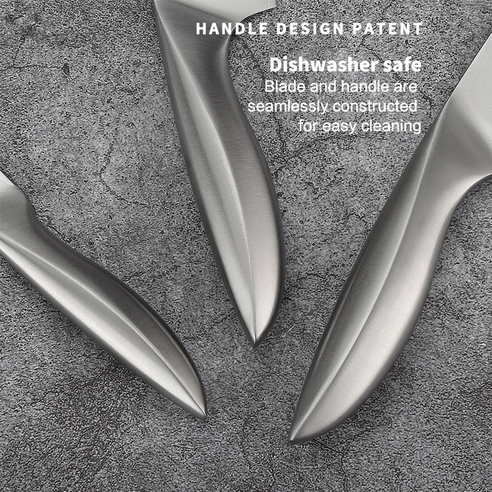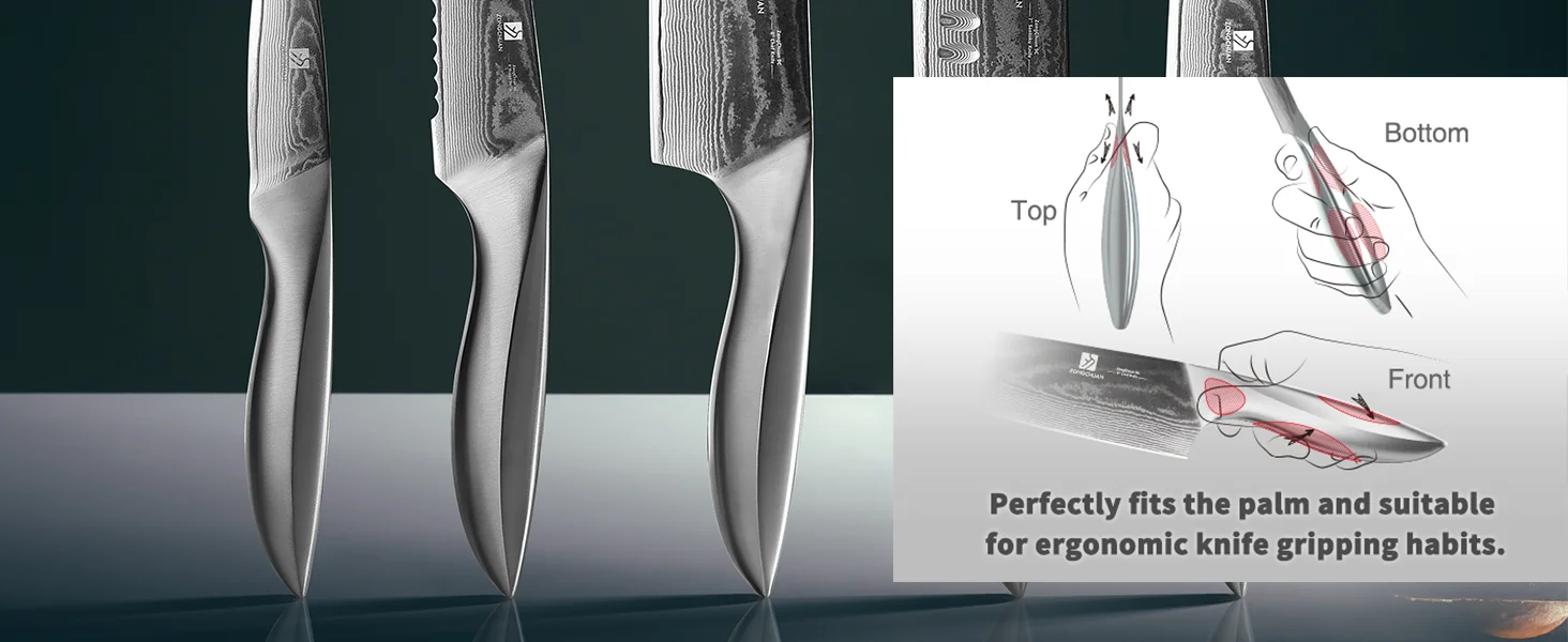 Our knives feature a revolutionary 3D minimalist handle for reduced fatigue and comfortable use. With full tang construction, contoured handles, and finely crafted diamond-shaped lines, they provide optimal balance, a secure grip, and a comfortable cutting experience without any hand discomfort.