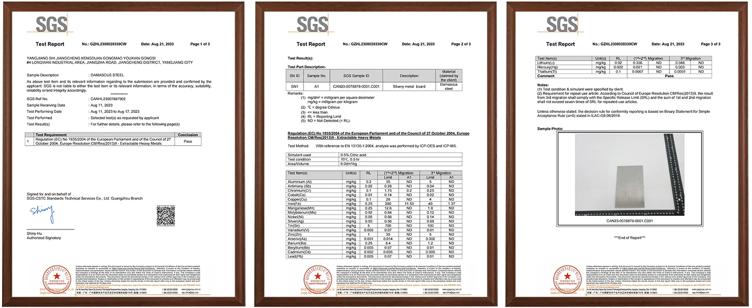 Our knives are made from 67-layer Damascus Steel, featuring a real damascus pattern that is not laser etched. They have passed SGS material testing certification for food contact safety. This ensures that our knives not only have a beautiful and enduring pattern that remains unchanged over time.