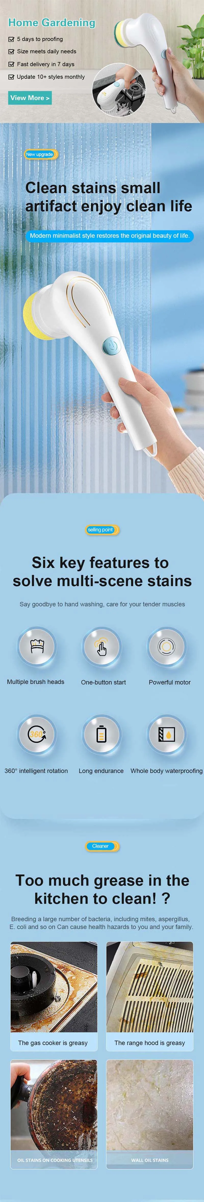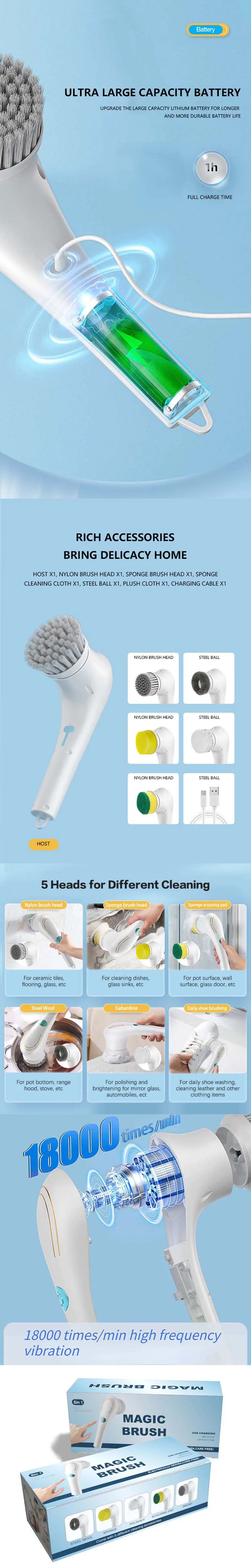 【Applicable Scenarios】: This cleaning brush contains 5 brush heads, which can be replaced in different scenarios. It could be a tub cleaning brush, a dishwasher brush.